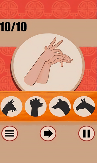 皮影艺术是一款充满传统文化韵味的创意猜谜游戏。在游戏中,玩家需要通过观察各种经典的皮影手势造型,来猜测它们所代表的形象或物品。这款游戏不仅能让玩家重温童年观看皮影戏的美好回忆,还能学习到许多有趣的皮影手势技巧。这些手势知识在日常生活中也能派上用场,比如用于肢体语言表达或即兴表演。游戏将传统艺术与现代玩法完美结合,让玩家在娱乐中感受中华文化的独特魅力。