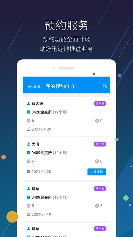 【我的预约】预约新产品,设置提醒功能,查看预约历史记录,合理安排业务时间。