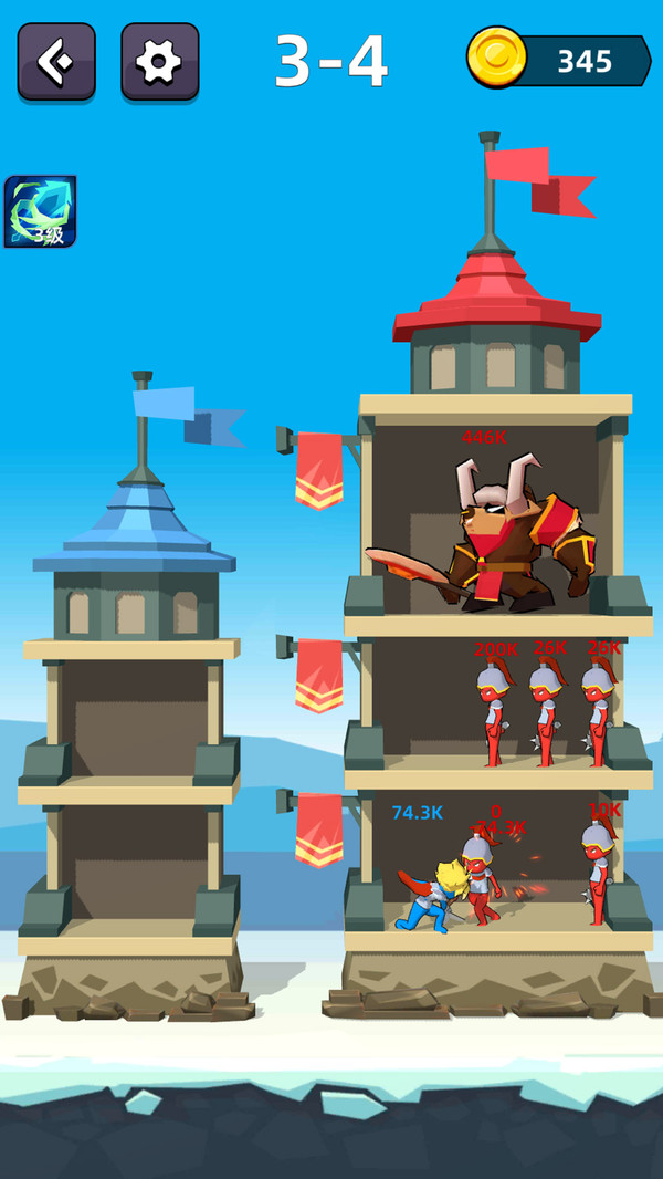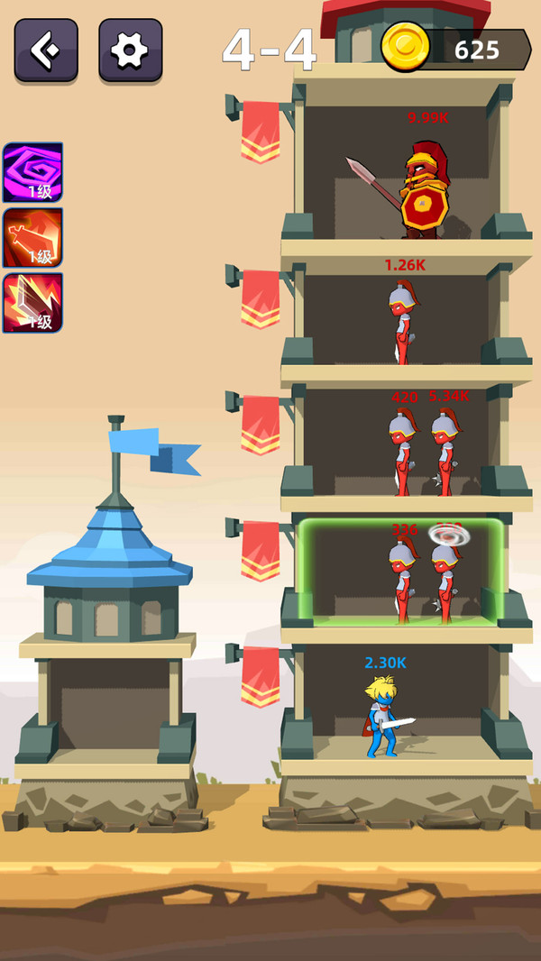 左边的蓝色城堡是我方阵营,右边的红色城堡代表的是敌方阵营,每一关卡分为四个小关卡,逐个通过每个小关卡才算挑战成功哦。建议新手玩家先熟悉每个小关卡的怪物特性,制定针对性的战术。