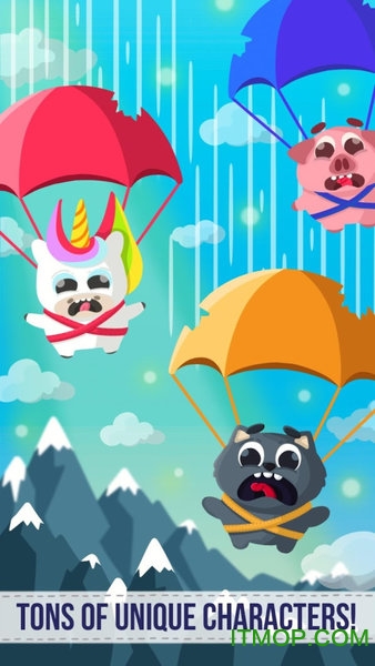 游戏拥有丰富多样的角色选择,从憨态可掬的小动物到奇幻的独角兽,甚至还有搞笑的香肠角色,每个角色都拥有独特的物理特性和降落体验。玩家需要精准控制角色的降落方向,在高速下坠的过程中收集散落在空中的各种道具和金币。但要特别小心那些隐藏在云层中的致命陷阱,一旦被击中就会导致任务失败。游戏还提供了数十种性能各异的降落伞供玩家解锁使用,不同的降落伞会带来完全不同的操控手感,让每次跳伞都充满新鲜感。