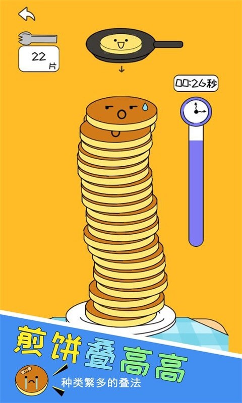 游戏界面采用清新简约的设计风格,明亮的色彩搭配和可爱的煎饼造型让人眼前一亮。游戏玩法简单易上手但充满挑战性,玩家需要精准控制煎饼的落点,让它们稳稳地叠在一起。操作手感流畅自然,物理引擎模拟真实,让玩家能感受到煎饼叠放时的重量感和平衡感。游戏还加入了多种趣味元素,如特殊形状的煎饼、随机出现的障碍物等,大大增加了游戏的可玩性。
