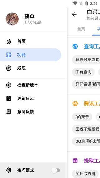 白菜工具箱app是一款由个人开发者精心打造的多功能手机工具箱软件。这款软件集成了大量实用且便捷的功能于一体,让用户无需下载多个应用就能享受到多样化的服务。无论是日常查询、文本转码、量角器测量,还是其他生活常用工具,白菜工具箱都能轻松应对,极大提升了用户的生活效率与便利性。此外,该软件还特别注重用户体验,其客户端体积小巧,占用手机内存极少,即使是低配置手机也能流畅运行,让每一位用户都能轻松玩转手机功能。
