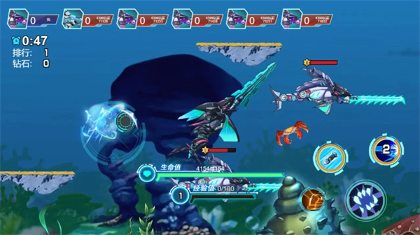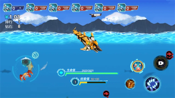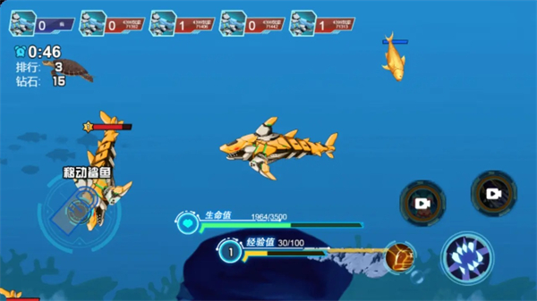 通过滑动屏幕上的虚拟摇杆来控制机械鲨鱼的移动方向,点击攻击按钮可以发动撕咬攻击。成功捕食其他鱼类后,鲨鱼会获得经验值并逐渐成长。
