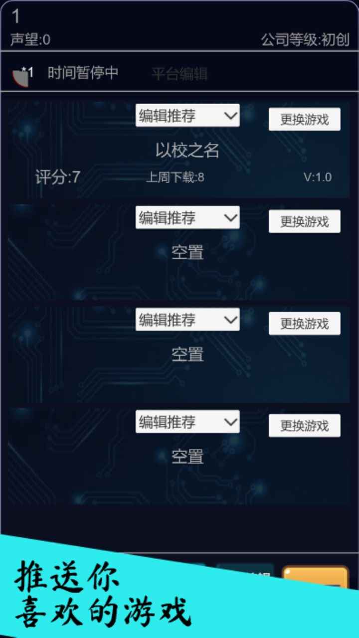 我的,一款充满创意与策略的手游开发模拟游戏。在这款游戏中,你将化身为一家新兴游戏公司的创始人,从零开始打造属于自己的游戏帝国。作为公司老板,你需要全面掌控游戏平台的运营与发展,包括招聘优秀员工、研发热门游戏、制定营销策略、拓展融资渠道等。通过广告投放、战略并购、平台运营等多种方式,逐步扩大公司规模,最终成为游戏行业的领军企业。
