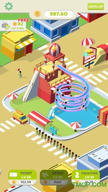 游戏提供了丰富多样的娱乐设施供玩家选择,每种设施都可以通过升级来提升吸引力。随着设施等级的提升,你将解锁更多有趣的玩法元素,比如令人眼花缭乱的幻灯片特效。同时,游戏还设计了多种类型的员工角色,从售票员到维修工,从表演者到清洁工,每个员工都拥有独特的技能和可爱的卡通形象。