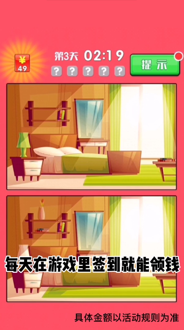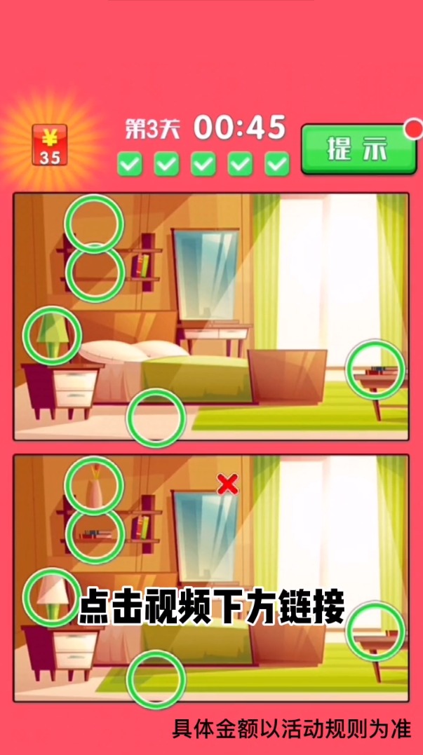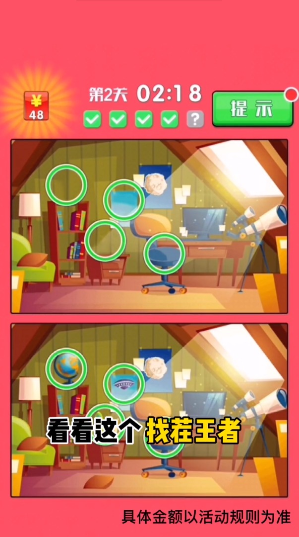 这是一款极具挑战性的休闲找茬手游,内含上百个精心设计的关卡,每个关卡都拥有独特的主题和风格。游戏采用渐进式难度设计,从入门级到专家级,满足不同玩家的需求。最吸引人的是游戏的红包奖励机制,玩家通过闯关可以赢取真实现金红包,让娱乐与收益完美结合。多样化的图片素材和创新的玩法设计,让每一次挑战都充满新鲜感。