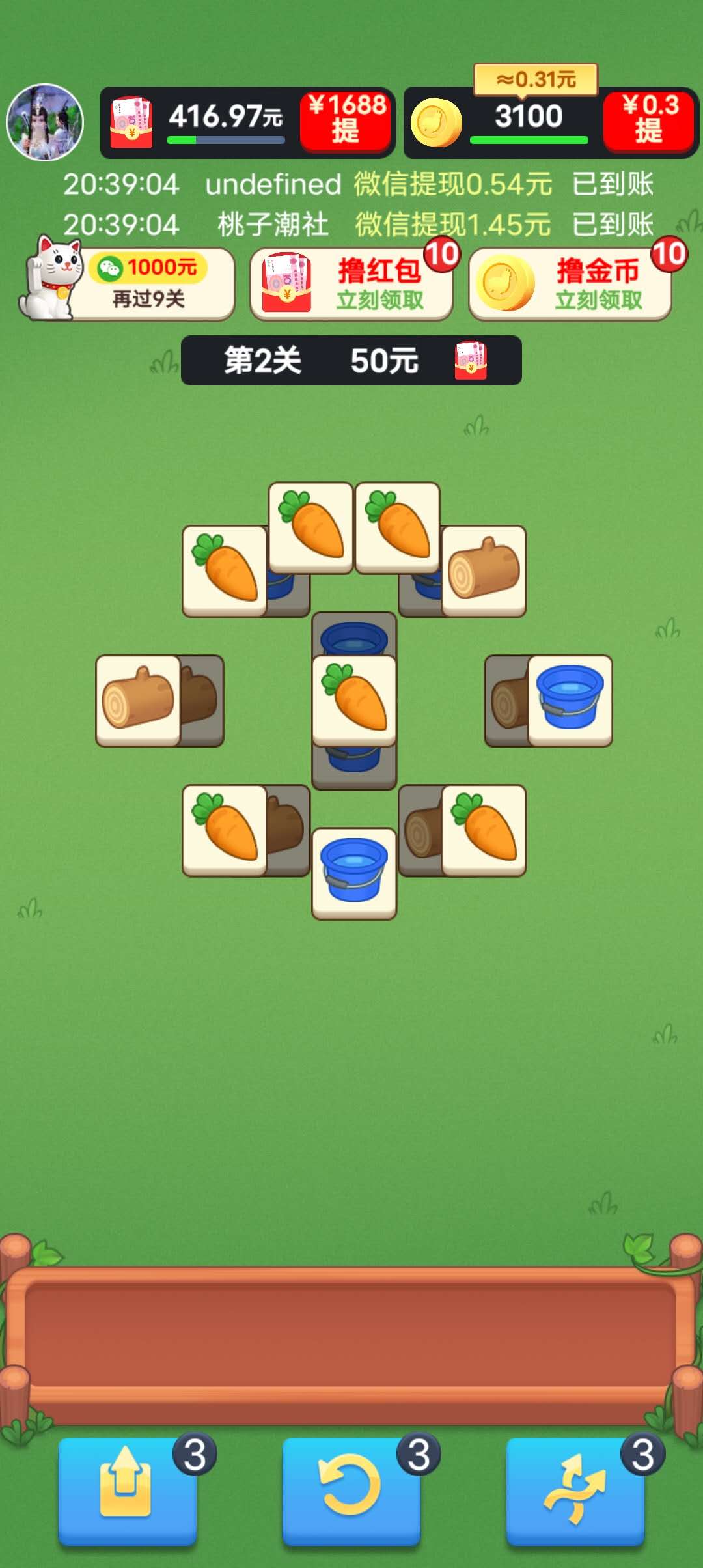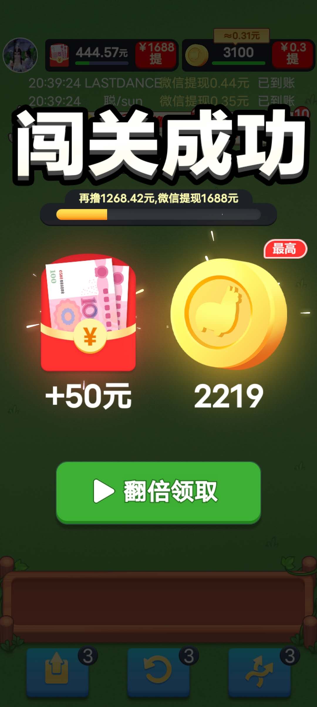 游戏初期奖励较为丰厚,但随着关卡深入,难度会逐渐增加。玩家反馈显示,前期可以轻松获得0.3元的小额红包,但后期无论是任务难度还是提现门槛都会提高。建议新手玩家可以先体验游戏机制,熟悉玩法后再考虑长期投入。