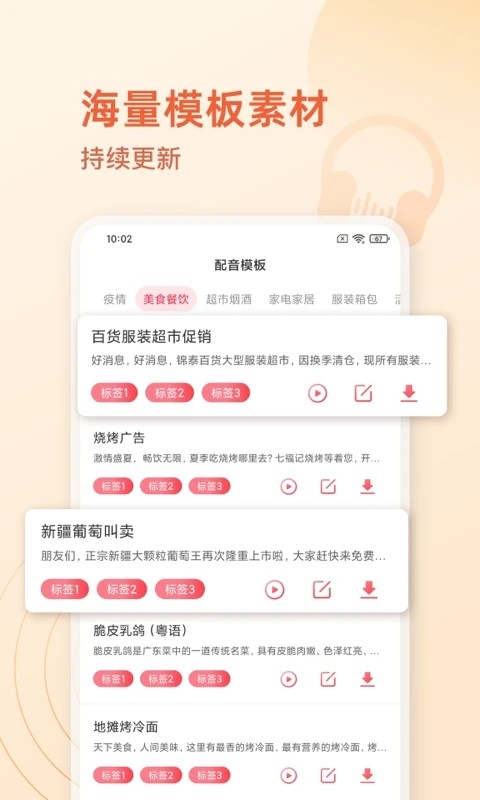 海量示例模板:软件提供了丰富的配音模板,涵盖广告促销、自媒体配音、解说、广播、企业宣传等多种场景。用户可以直接套用模板,快速完成专业级配音作品。