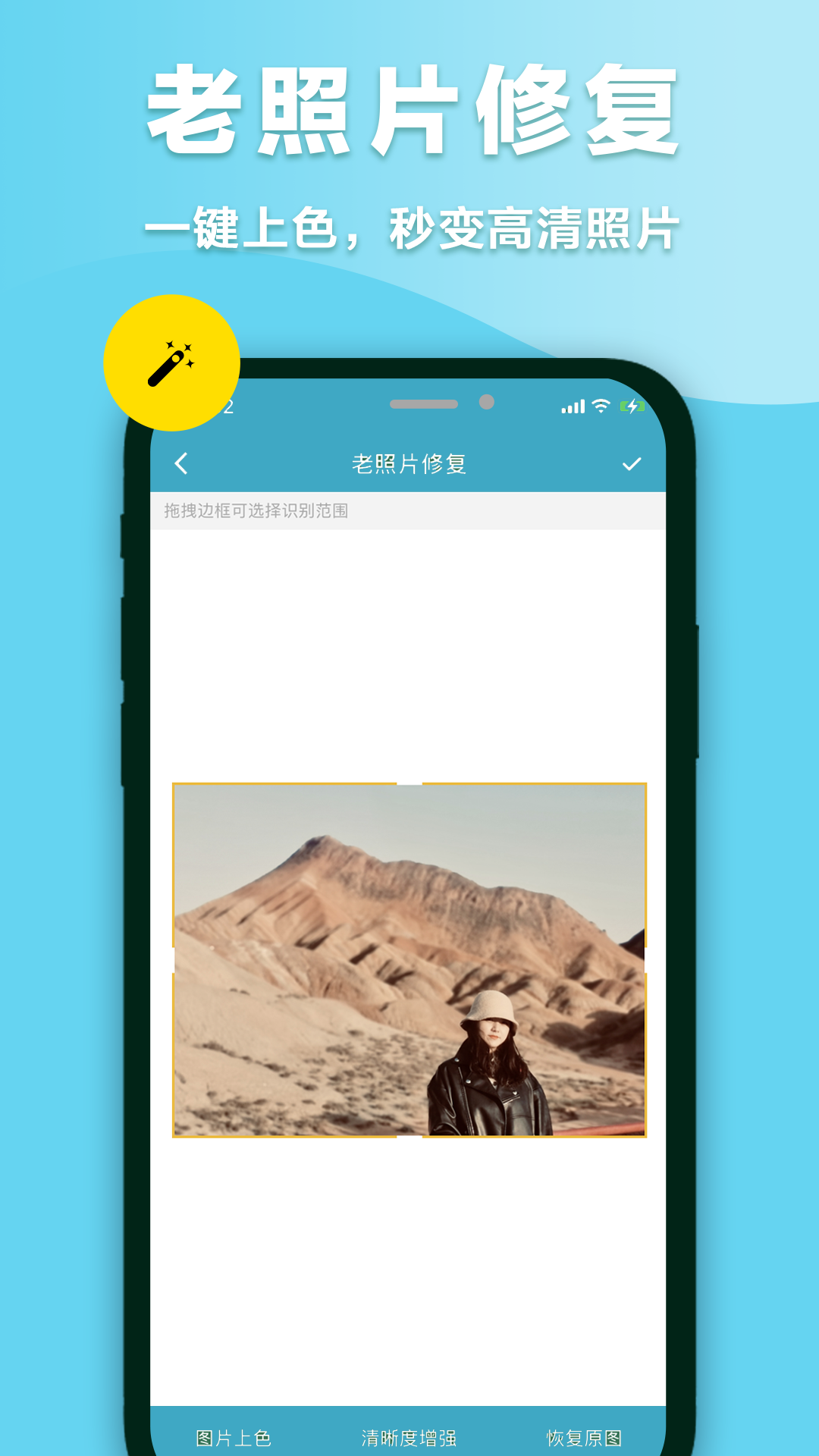 *针对破损、褪色或泛黄的老照片,应用提供一键修复功能,可将老照片还原为高清彩色照片,让珍贵回忆重现光彩。