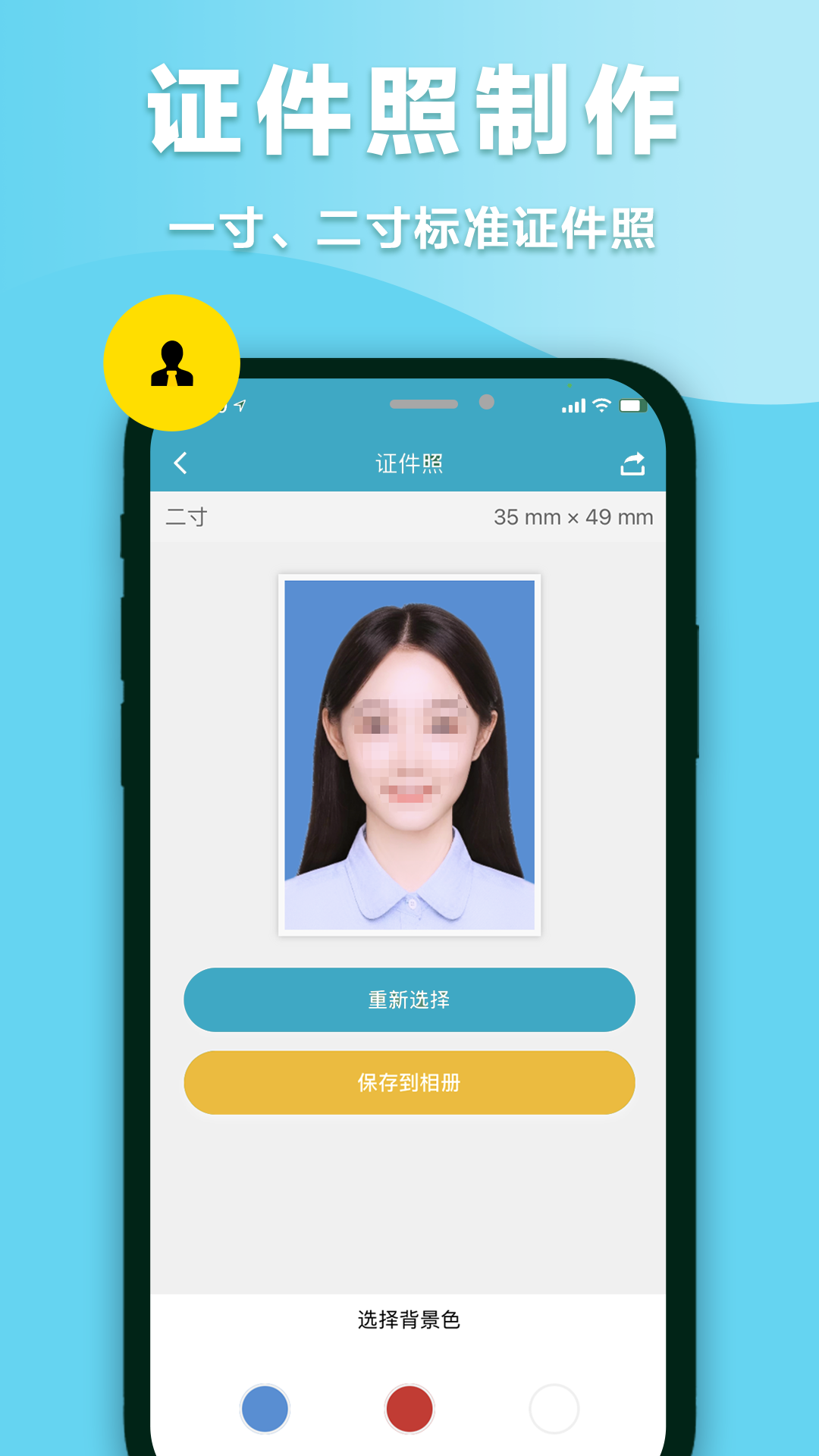 *提供专业的证件照制作功能,支持任意切换背景颜色,轻松制作宝宝证件照、学生证件照、工作证件照等各种规格的证件照片。