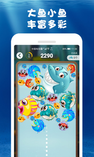 游戏拥有独特的合成机制,玩家需要仔细观察画面中的各种小鱼,将相同种类的小鱼进行合并升级。随着游戏的进行,玩家可以解锁更多种类的海洋生物,从可爱的小丑鱼到威武的大白鲨,最终目标是合成出梦幻般的巨型鲸鱼。每次成功合成都能获得丰厚的分数奖励,特别是当玩家合成出最大的鲸鱼时,更能获得令人惊喜的高分。游戏采用了清新可爱的卡通画风,设计了数十种形态各异的海洋鱼类,为玩家带来丰富多彩的视觉体验。