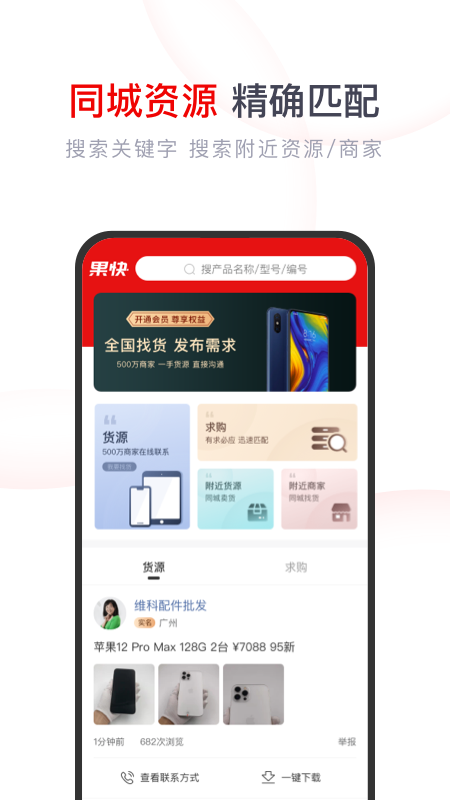 果快找货整合全国二手机信息平台,500万货源信息,1秒匹配,精确度98%;平台采用先进的大数据技术,通过智能算法分析用户需求,确保匹配结果的精准性。同城附近商家整合,迅速找到你需要的店铺信息;平台还提供商家信用评级系统,让交易更安全可靠。为商家赋能提升商家核心竞争力和增加营收,通过精准流量导入帮助商家提升30%以上的成交率。