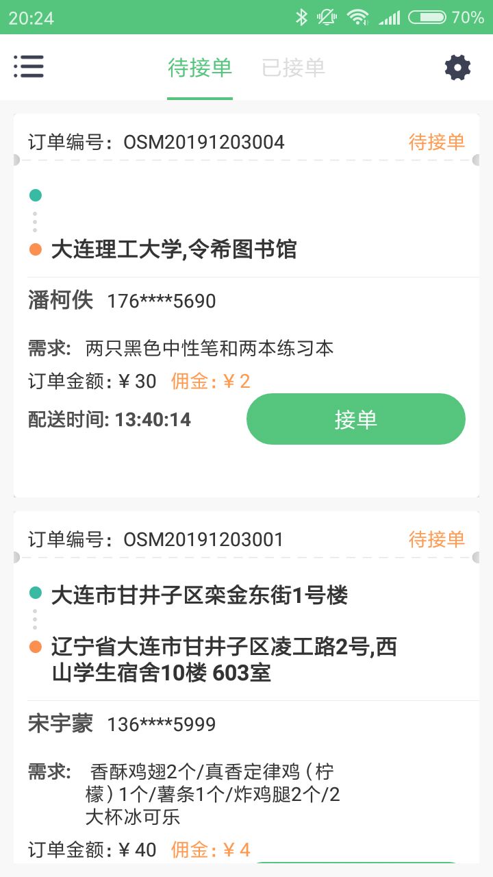 【实时接单】系统基于LBS定位智能推送周边订单,骑手可根据课程安排自由选择接单时段,通过语音播报和震动提醒确保不漏单。订单详情页清晰展示取货地址、配送距离和预计收益,帮助骑手高效规划路线。