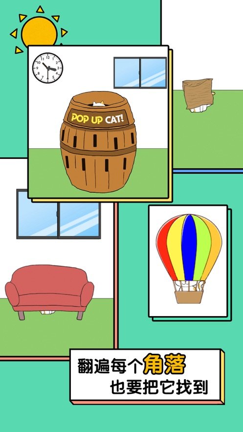使用道具进行拖放,合理的使用,找出藏在房间里的猫咪。道具系统设计巧妙,比如使用逗猫棒可以吸引猫咪移动位置,喷水壶能让躲在窗帘后的猫咪现形。合理运用道具是通关的关键。
