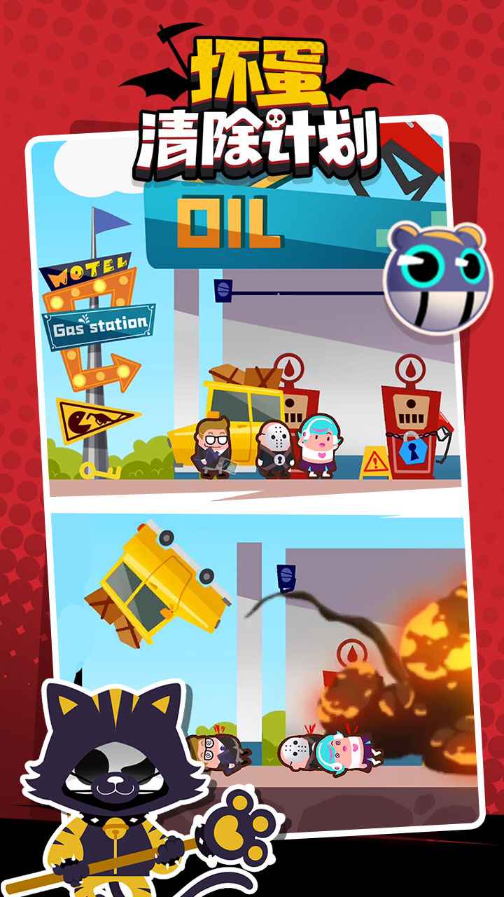 1.该游戏采用低多边形美术风格,角色动作通过物理引擎驱动产生真实的碰撞反馈。当坏蛋被钢琴砸中时,夸张的肢体变形配合"砰"的音效令人忍俊不禁,而油桶爆炸时的慢镜头特写更是充满戏剧张力。