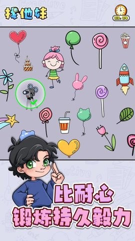 《找他妹》是一款需要手眼脑高度协调的益智游戏,不仅考验玩家的观察力,更强调联想能力和快速反应。游戏开始时系统会明确给出通关目标,玩家需要在限定时间内找出所有指定图案。随着关卡推进,图案差异会越来越隐蔽,需要玩家全神贯注才能发现。成功找出全部差异即可过关,若时间耗尽仍未完成则宣告失败。这种玩法设计能充分展现玩家综合能力,在娱乐中提升认知水平,是一款寓教于乐的精品游戏。