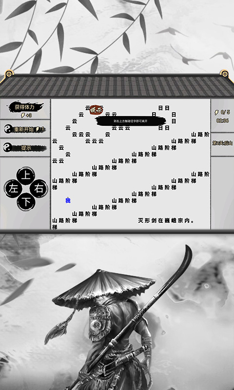 作为最终关卡,本关融合了所有已学技巧。需要先用"箱"字作为掩体躲避移动的"鬼"字,这要求精准的时机把握。成功潜入下一区域后,玩家将面对五大门派的最终对决,通过之前积累的文字操作技巧逐一破解,最终完成复仇使命,体验剧情与玩法的高潮收尾。