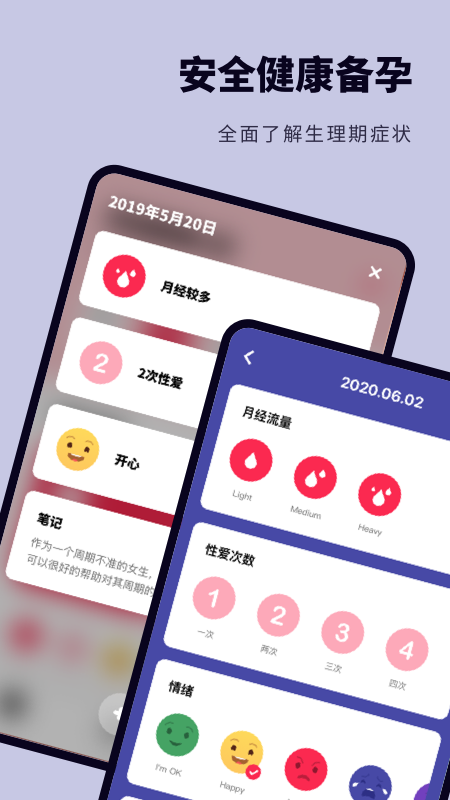 1、科学记录和跟踪生理周期,准确计算排卵期、安全期、姨妈期等。系统会根据用户的历史数据自动优化预测模型,随着使用时间的增加,预测准确率可达到90%以上。