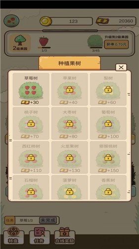 3、游戏强调精细化管理,每种果树都需要玩家投入时间和精力进行照料。从浇水施肥到防治病虫害,每个环节都会影响最终的收成。认真经营的玩家将获得更丰厚的回报。