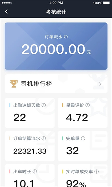 1、软件提供全方位的运营数据统计,包括接单量、收入曲线、服务评分等核心指标。司机可以通过可视化图表分析自己的运营状况,还能设置每日收入目标,获得智能化的接单建议。