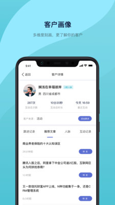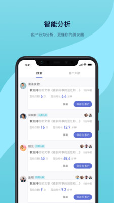1、通过深度数据挖掘技术,软件可全面分析客户的浏览习惯、消费偏好等行为特征,生成详细的客户画像,帮助您准确把握每个客户的个性化需求。2、内置智能通讯录管理系统,不仅能自动归类客户信息,还能根据联系频率智能提醒跟进,确保您不错过任何重要商机,实现随时随地高效沟通。3、独创的智能名片编辑器支持多种模板选择,用户可自由调整版式、颜色和内容,还能嵌入动态二维码,让您的商务形象更加专业出众。