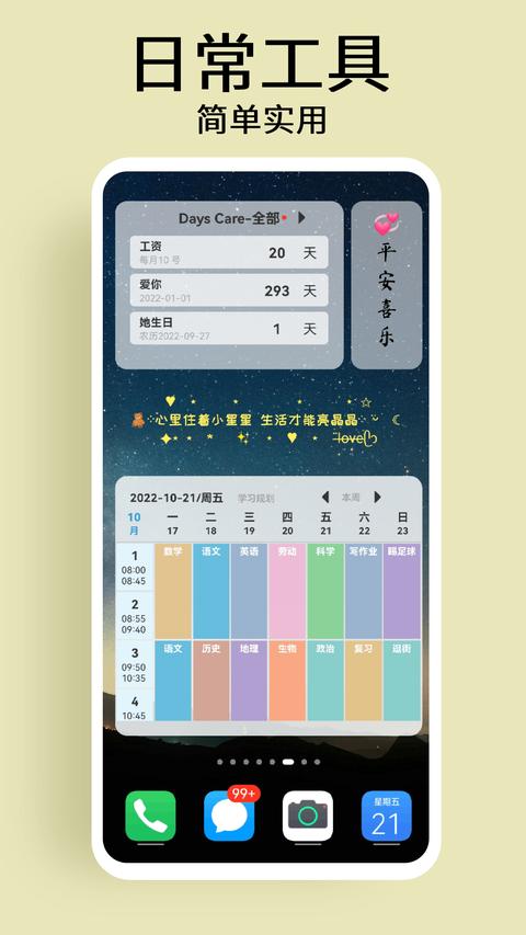 ・透明小组件功能让您自由调节透明度,完美融入各种风格的手机壁纸,打造浑然一体的视觉效果。背景和文字颜色支持面板调色,提供丰富的色彩选择,满足您对个性化配色的所有想象。十几种不同尺寸的小组件可供选择,支持自由拉伸调整,完美适配各类手机屏幕尺寸。操作界面简洁明了,功能实用性强,您可以根据桌面整体配色DIY专属风格,让每个细节都彰显独特品味。