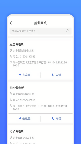 2、发送停电公告、预约校表、找充电桩、意见反馈等功能。特别值得一提的是充电桩查询功能,为新能源车主提供了极大便利,而意见反馈通道则让用户的声音能够直达电力服务部门。