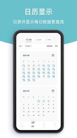5、每日统计日历,能够呈现出每日的喝水数据和趋势变化;日历视图清晰标注每日达标情况,支持快速跳转到任意日期查看详情。年度统计报告功能让您全面了解整年的饮水健康状况。
