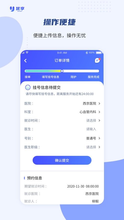优享服务APP是一款专注于医疗陪护领域的专业服务平台,主要为就医患者提供全方位的陪同就医解决方案。用户可以通过手机APP轻松下单,系统会智能匹配经验丰富的专业陪诊员。这些陪诊员都经过严格培训,具备专业的医疗知识和丰富的陪诊经验,能够为患者提供从挂号、就诊到检查、取药的全流程陪同服务。无论是初次就诊的迷茫,还是复诊检查的繁琐,陪诊员都能给予专业的指导和贴心的帮助,让就医过程更加顺畅。