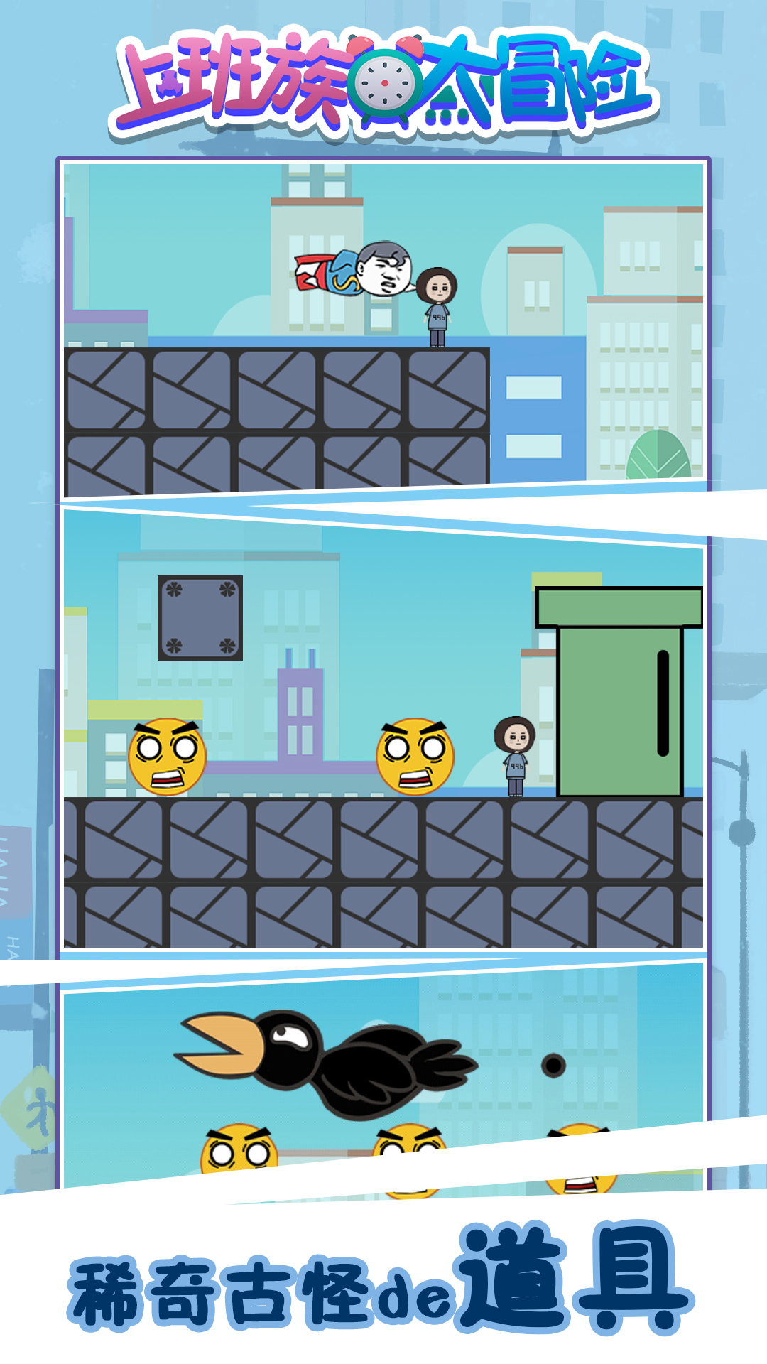 完全自由独特的闯关历险,拿着公文包上班就要迟到了,上班的路上有无数的阻碍等你跨越。游戏还加入了道具系统,玩家可以收集咖啡杯获得短暂加速,使用雨伞抵挡从天而降的障碍物等。