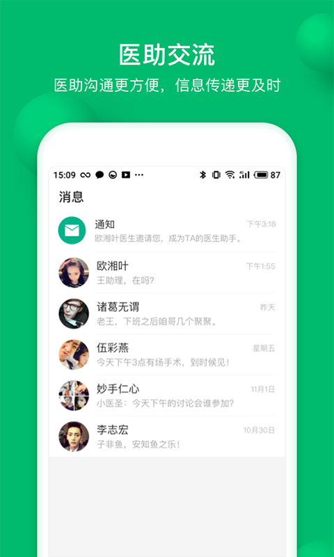 医助交流:提供即时通讯功能,支持文字、语音、图片等多种沟通方式,确保医疗团队内部信息传递及时准确,大幅提升协作效率。