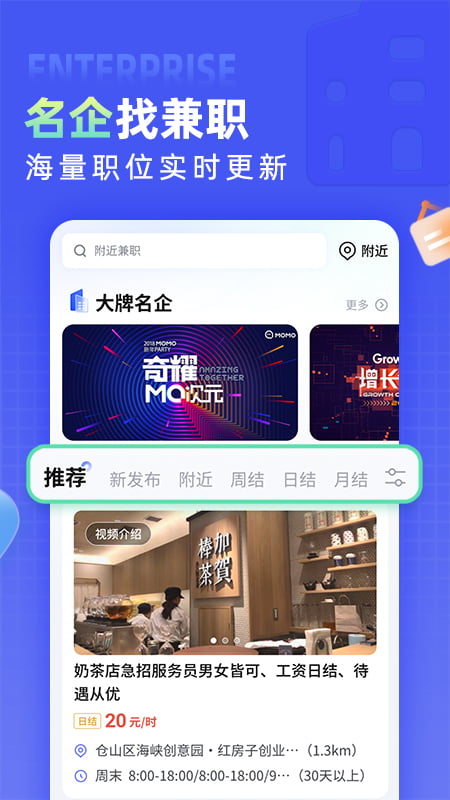 兼客直聘是一款专注于线下兼职招聘的移动应用,为用户提供随时随地找工作的便捷体验。平台汇集了大量优质企业资源,包括连锁品牌和行业领先公司,涵盖送餐员、快递员、营业员等多种岗位类型。求职者可以根据自身需求选择日结或月结的工作,享受平台提供的多重保障服务。无论是短期兼职还是长期就业,都能在这里找到合适的机会,让求职过程更加省心高效。