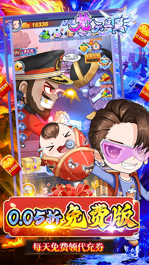 梵天巨翼折扣版是一款颠覆传统的三国题材放置卡牌手游,游戏以独特的嘻哈风格重新诠释了三国群英形象,搭配Q版卡通画风和夸张的战斗特效,为玩家带来耳目一新的视觉体验。在这里,你可以收集上百位造型各异的三国名将,从手持麦克风的嘻哈曹操到踩着滑板的潮流吕布,每位武将都拥有专属技能和战斗风格。游戏采用创新的放置+点击玩法,前期通过点击屏幕释放技能,解锁武将后即可开启自动战斗模式。丰富的PVE副本、刺激的PVP竞技场以及独特的武将养成系统,配合全自动托管功能,让玩家无论是通勤路上还是工作间隙都能轻松享受游戏乐趣。更有海量福利活动和超值折扣充值,助你快速组建梦之队,开启属于你的三国霸业!