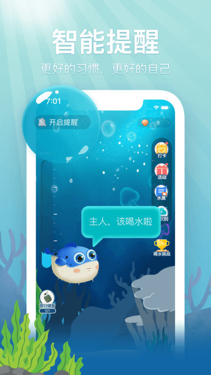 萌萌的喝水鱼宝宝会全程陪伴您的饮水生活,根据您的饮水进度变换不同表情和动作。当您完成每日8杯水的目标时,2265种不同的互动效果将给您带来惊喜。鱼宝宝还会适时给予鼓励话语,让枯燥的饮水过程变得生动有趣。