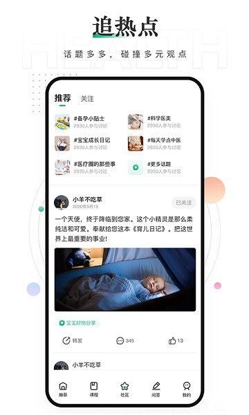 2、构建开放共享的社区环境,用户可自由分享个人健康管理心得、育儿经验及疾病康复历程,形成互助互学的良好氛围。