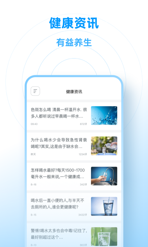 -专业的健康资讯板块,定期推送养生知识,让用户获得更多科学饮水指导