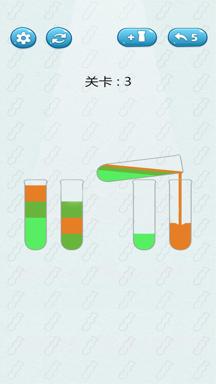 3、游戏特别考验玩家的空间规划能力,在合并颜色时,必须确保目标瓶子有足够容量,否则无法完成倒沙操作;