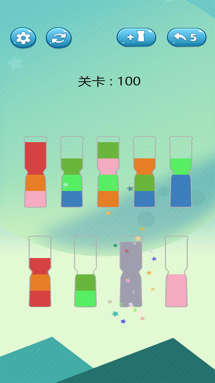 2、游戏核心目标是完成所有沙子的颜色分类,玩家需要仔细观察每个杯子中的沙子分布,制定最优的倒沙顺序;
