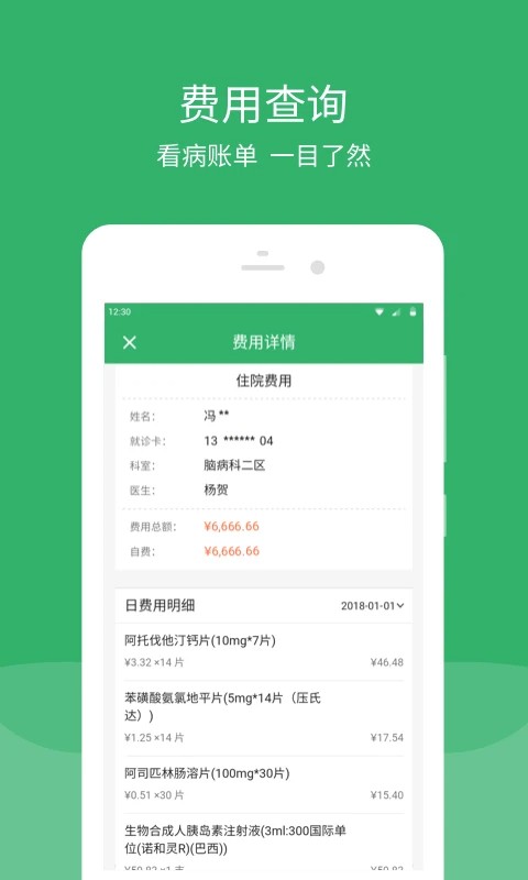 费用查询:详细展示每笔医疗消费明细,包括药品清单、检查项目等,让医疗消费透明化、可视化。