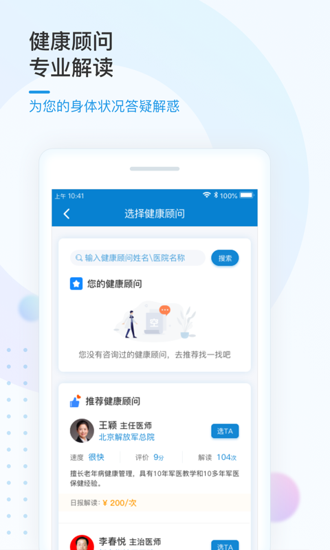 健康顾问专业解读:软件配备专业医疗团队,为用户提供个性化的健康咨询和指导,解答各类健康疑问。