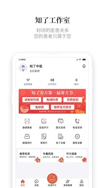 多患者体系:采用云端存储技术,永久保存患者完整病历资料,支持多终端随时调阅。患者私有化管理:提供智能分类标签功能,便于医生建立患者档案库,积累诊疗口碑。优质药事服务:严格筛选道地药材供应商,实施"一方一码"全程追溯制度,确保药品质量。知了诊室:创新性地将线下诊疗场景数字化,实现线上线下服务无缝衔接,形成完整的中医服务闭环。平台还定期举办线上学术交流活动,促进医生间的经验分享与专业提升。