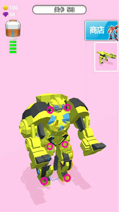 《机器人大变身》是一款集模拟、解压与益智于一身的休闲游戏。在这个充满想象力的机械世界中,玩家可以通过简单的拖拽操作,将散落的零件组装成完整的机器人。每个零件都经过精心设计,可以自由组合成汽车、飞机、铲车等多种形态。游戏特别加入了物理变形系统,让机器人的每个变形动作都显得自然流畅。除了基础形态外,游戏还隐藏着众多传奇机器人等待玩家发掘,每个传奇机器人都有独特的变形方式和特殊技能。随着游戏进程的推进,玩家还能解锁更多高级零件和稀有涂装,打造出专属于自己的终极机器人。