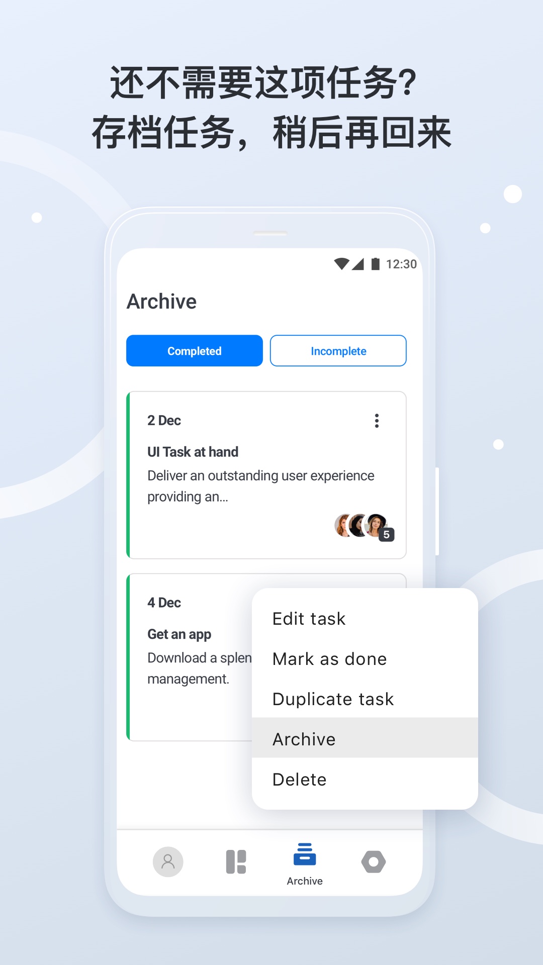 便捷的任务存档系统:对于暂时不需要处理的任务,用户可以将其存档保存。存档任务不会干扰当前工作流程,需要时只需简单操作即可重新激活,确保重要事项不会被遗忘。