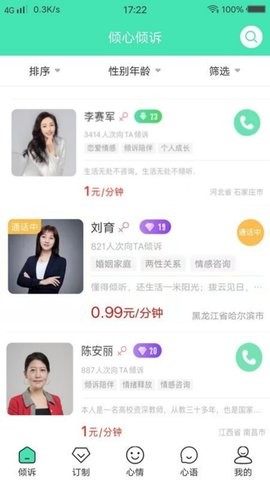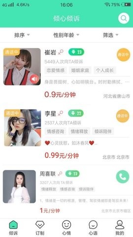 进入倾心倾诉中心后,您可以浏览完整的倾诉人员列表和对应价格,选择心仪的服务人员后点击电话图标即可联系;