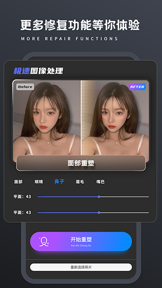 1、自动修改老照片及躁点,修改模糊照片、低清照片及斑驳痕迹等。面部算法,还原本来面貌。软件采用先进的面部识别技术,能够精准修复人物面部特征,让老照片中的人物重现青春风采。