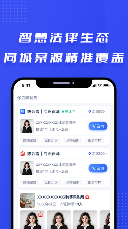 1、平台整合全国5万+执业律师资源,按照32项专业标签精细分类。独创的服务质量监测体系,通过用户评价、响应速度等18项指标持续优化服务体验,用户满意度长期保持在96%以上。