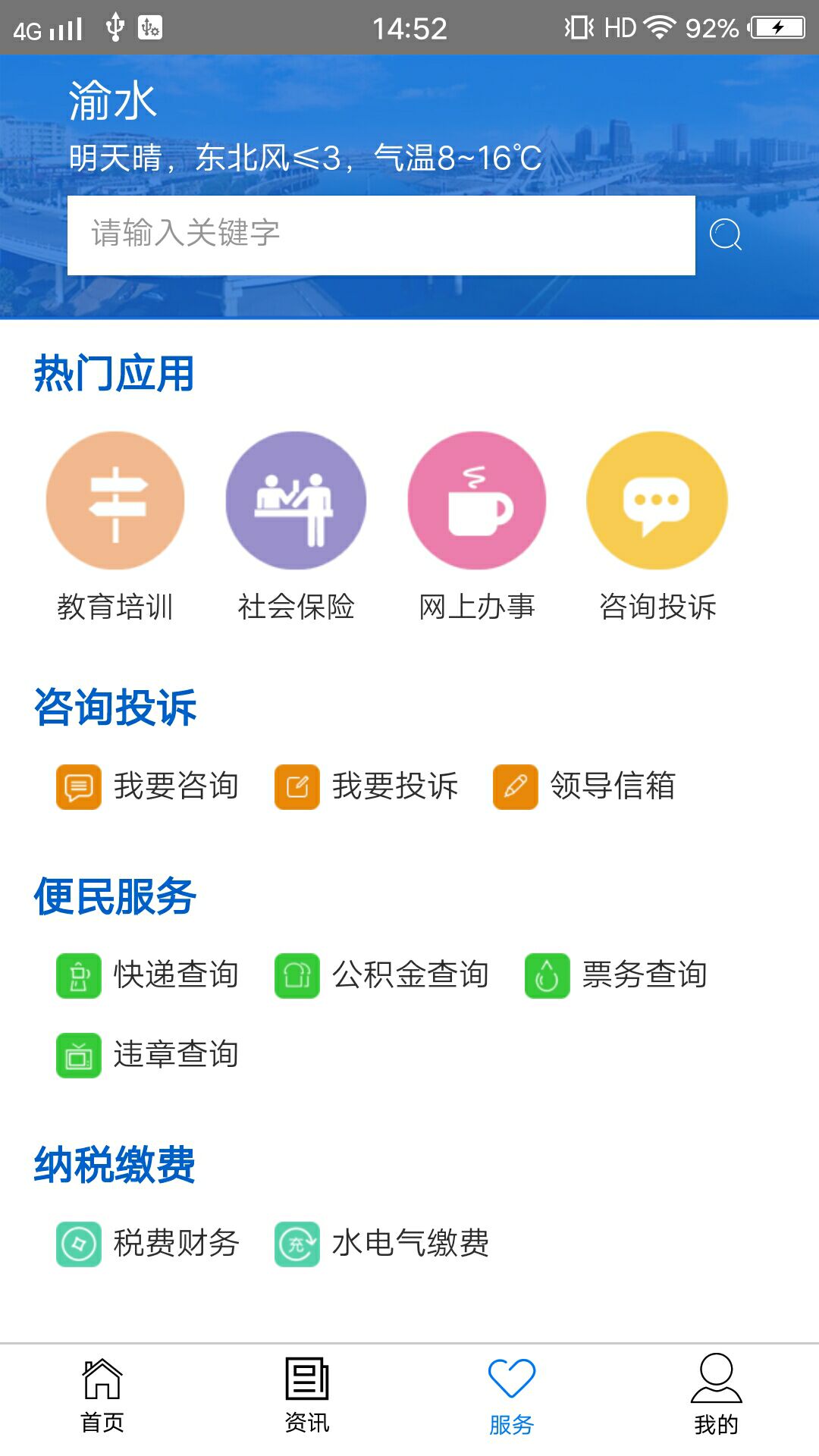 该应用集成了教育培训、社保查询、网上办事、咨询投诉等多项实用功能,满足市民多样化需求。其中"我要咨询"和"领导信箱"功能搭建了政民沟通的桥梁,让市民的意见建议能够直达相关部门。"快递查询"、"公积金查询"、"违章查询"等便民工具让生活更便捷。此外,平台还提供税费缴纳、水电燃气缴费等一站式服务,真正实现"数据多跑路,群众少跑腿"的服务理念。所有功能都经过精心设计,确保操作简单、响应迅速。