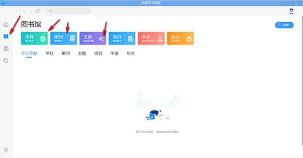 2、在界面左侧导航栏中点击"图书馆"选项,系统提供了学科、期刊、主题、项目、学者、热点等多种分类方式,用户可以根据需求选择相应分类查找目标文献;