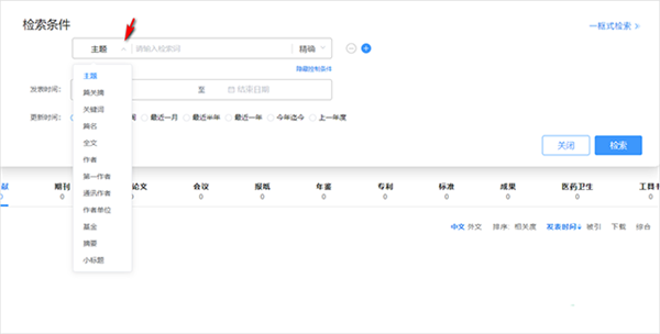 4、在高级检索界面,用户可以通过下拉菜单选择按主题、作者、机构等不同字段进行组合检索,确保检索结果更加精准;