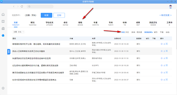 6、在搜索结果页面,用户可以通过顶部标签切换查看不同类型的文献(如学位论文、报纸、专利等),还能设置语言筛选(中文/英文)和排序方式(相关度/发表时间等),点击具体文献标题可查看详细摘要信息;